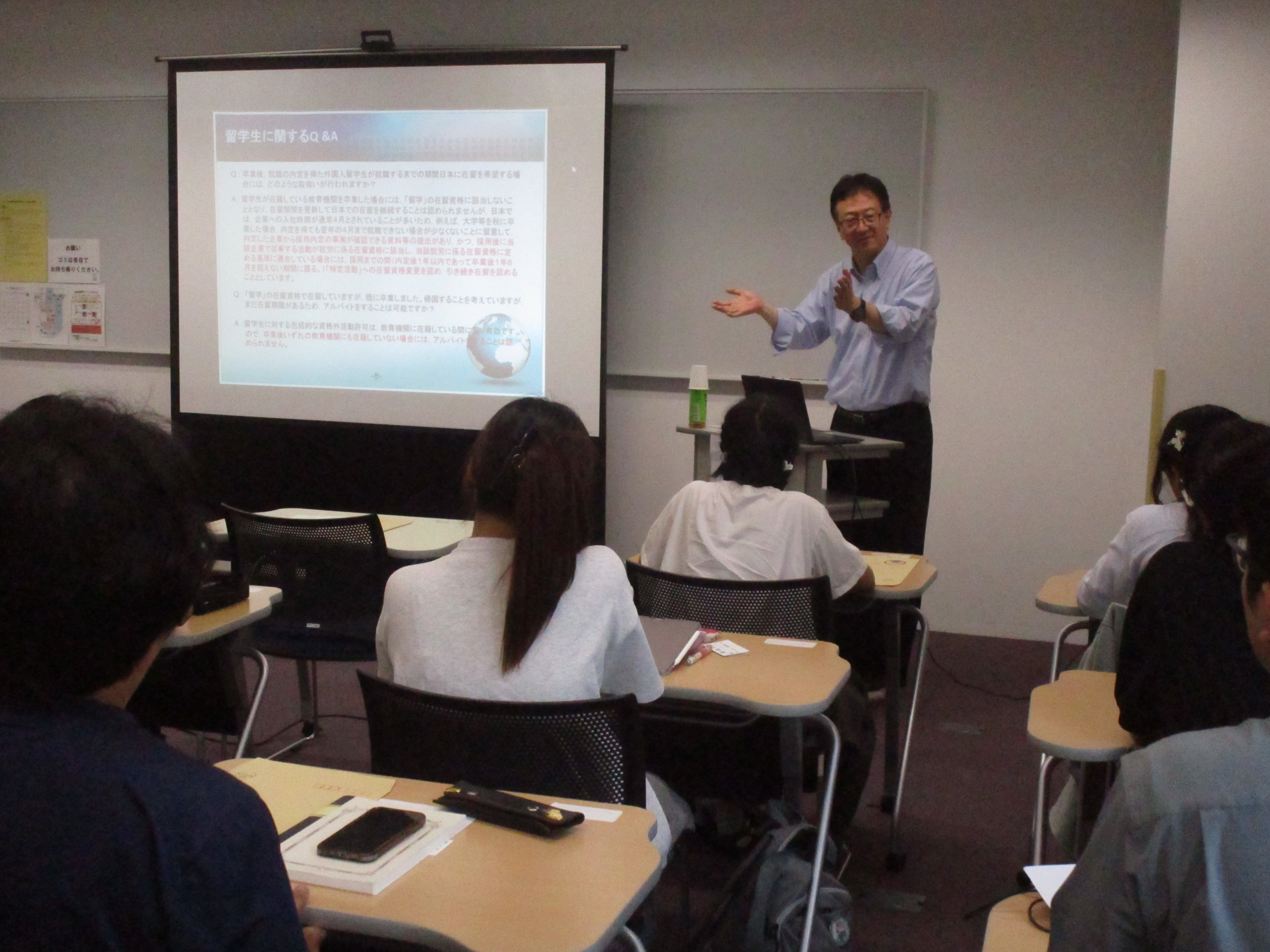 The first half covered the fundamentals of job-hunting. They learned about what Japanese companies seek in international students, the differences between job-hunting and employment practices in Japan and overseas, the importance of Japanese language skills, and how to prepare for interviews.