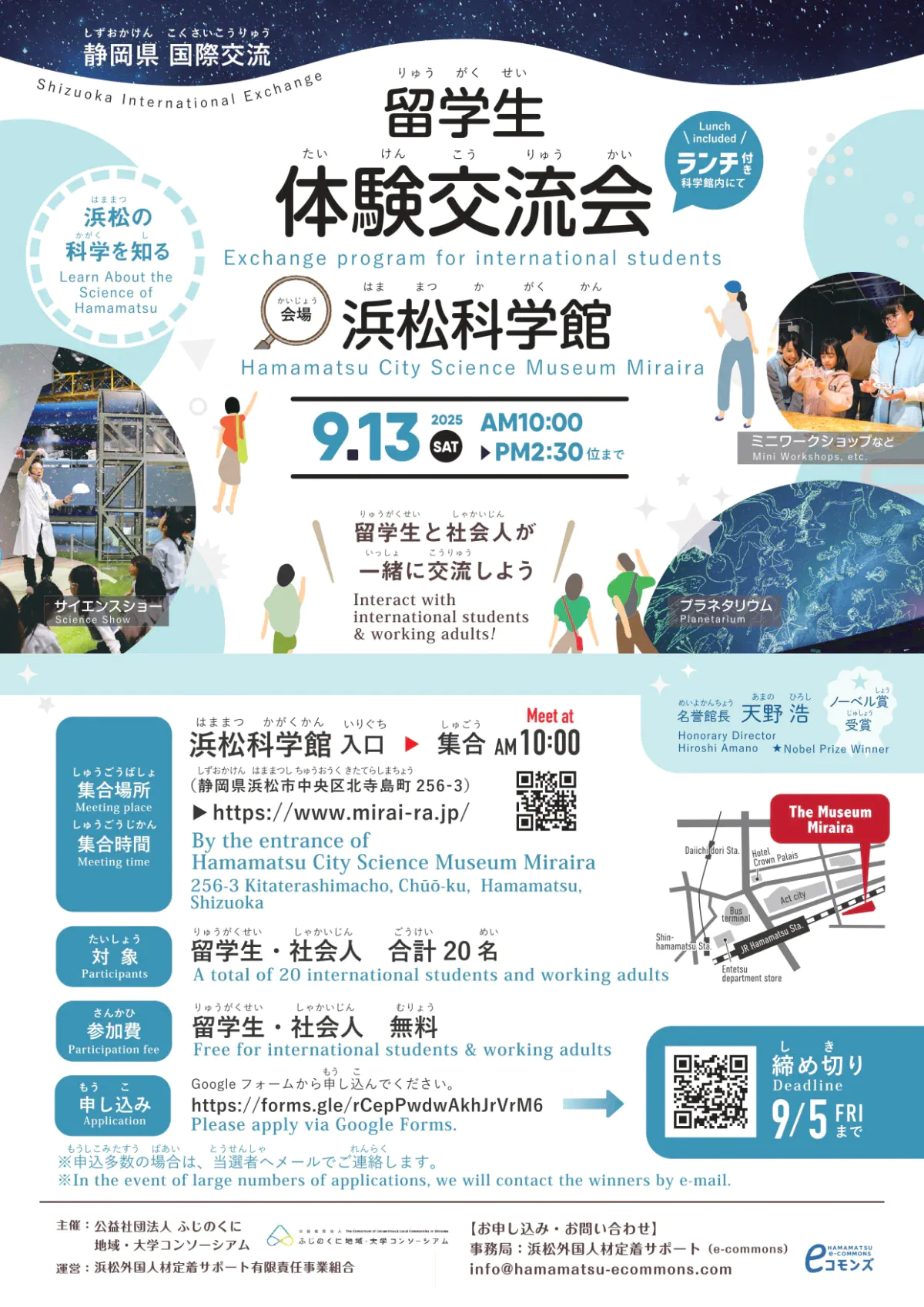 レポート [留学生&社会人交流会] 2025/10/03 Share [留学生&社会人交流会]2025年9月13日に留学生と社会人の交流会を行いました。場所は浜松市科学館です!留学生から日本での暮らしや静岡の会社や仕事のこともたくさん教えてもらいました‼️ Prev ニュース&トピックス一覧へ Next