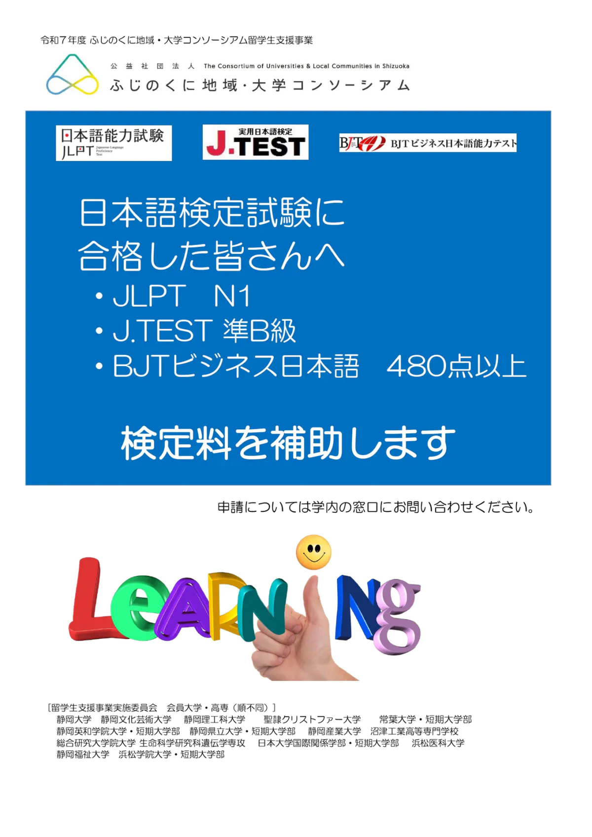 ふじのくに地域・大学コンソーシアムの留学生支援事業実施委員会会員大学・高専に所属する留学生にGood News!